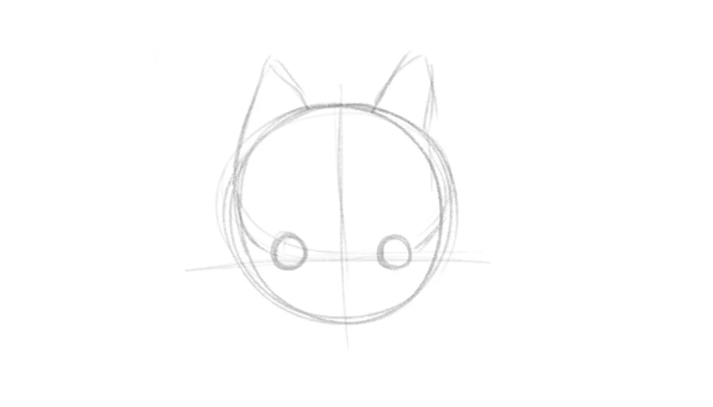 Roughly draw in the facial features like the ears (triangles), eyes (circles), nose and mouth area.
