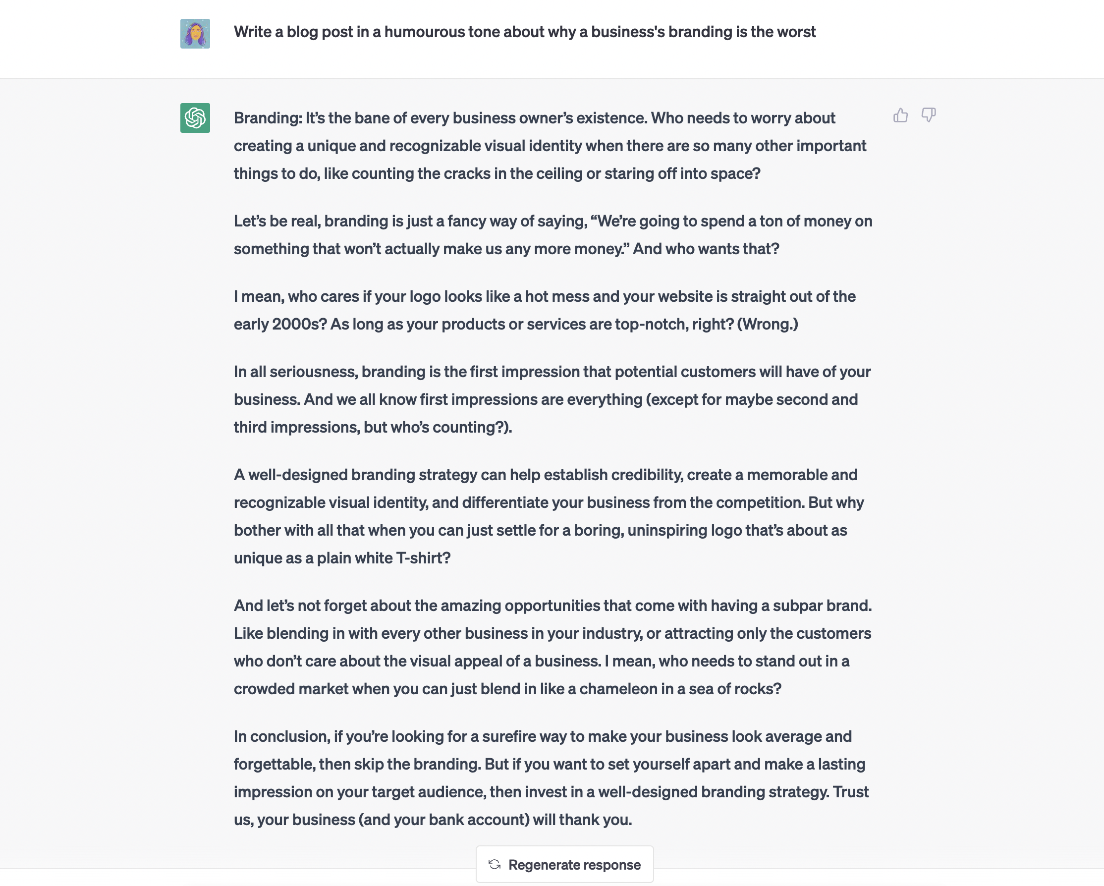 “Write a blog post in a humourous tone about why a business's branding is the worst.”