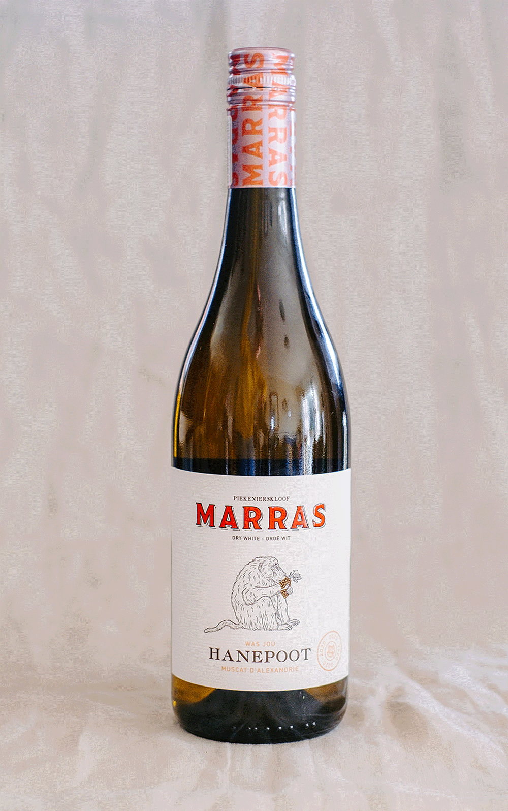 Marras ‘Was Jou Hanepoot’ is a dry white wine made from Muscat d’Alexandria grapes, locally known in South Africa as ‘Hanepoot’, a grape variety the wild baboons are known to go crazy for.
